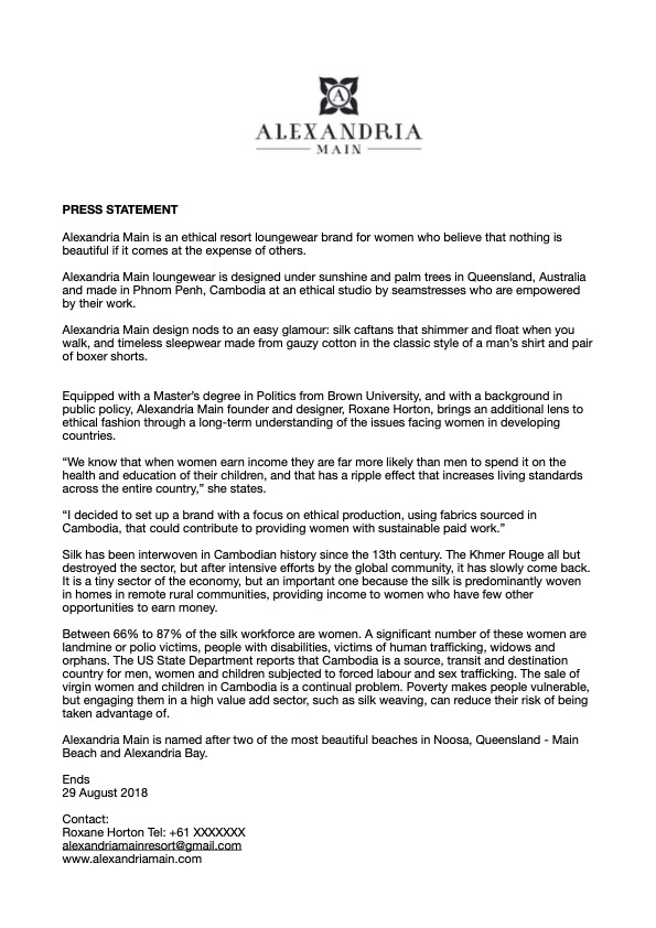 I’m very pleased to introduce you to my brand [Alexandria Main]. Please find attached a Media Statement and a couple of images for your interest. Don’t hesitate to contact me if you require more information or if you would like me to provide samples for any purpose.